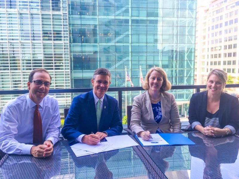 | | UVA Batten Dean Allan C. Stam and NASPAA Executive Director Laurel McFarland sign the 5-year student Simulation Competition affiliation agreement. Also shown: Bill Ashby, Senior Associate Dean for Administration at UVA Batten and Leigh Anne Elliott, NASPAA's new Education and Events Manager. |