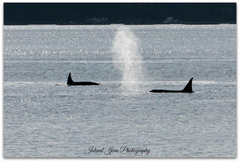 | T46 and her son T46D (born 2000) in Penn Cove. "Looked like 4 and they were getting seals." Photo by Jennifer Swenson Dohner, January 31, 2017 (ID's by Melisa Pinnow, Center for Whale Research) |