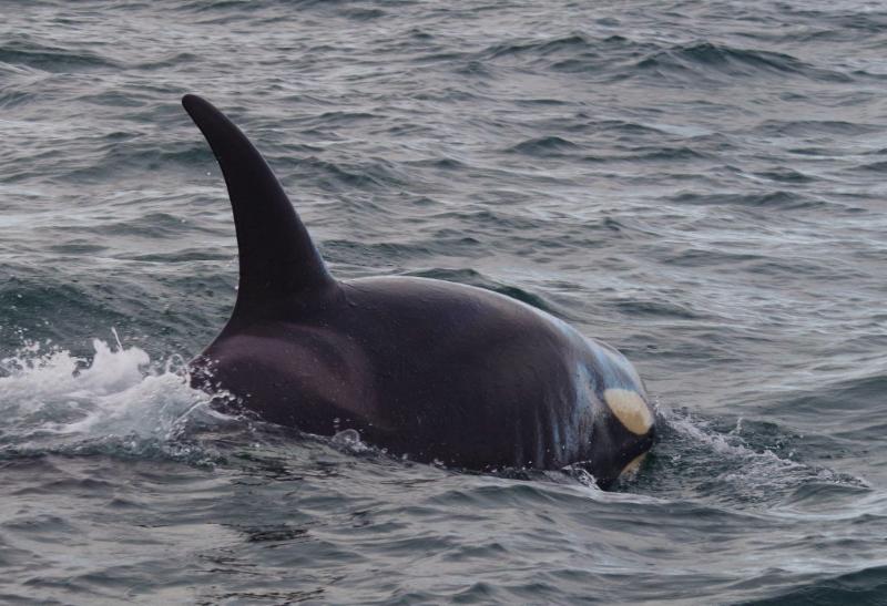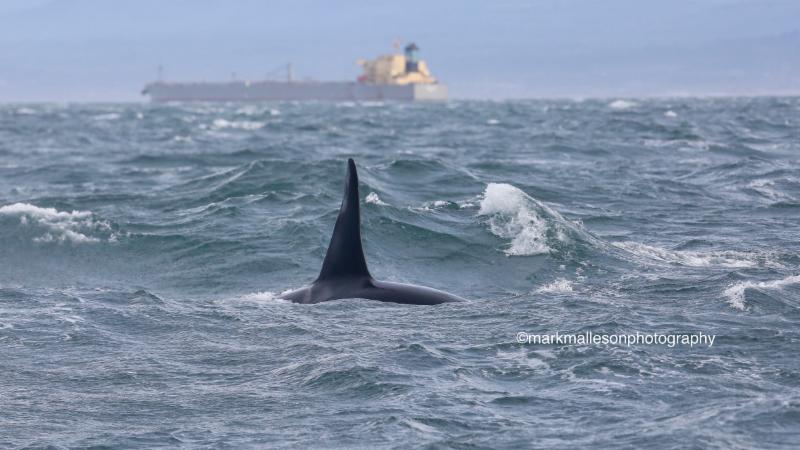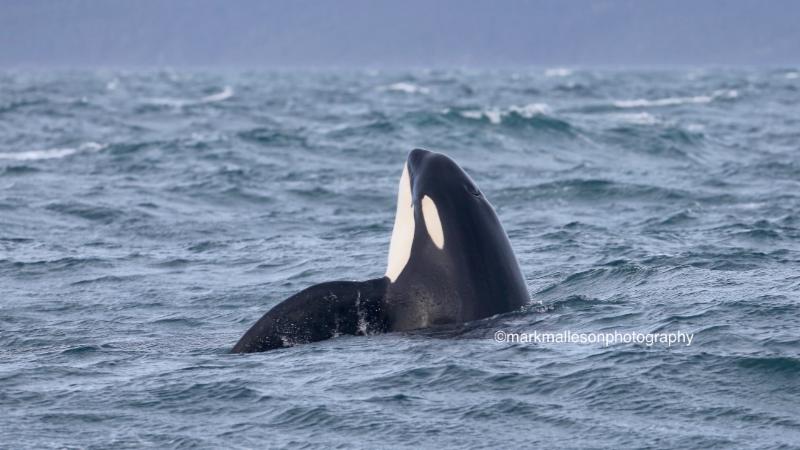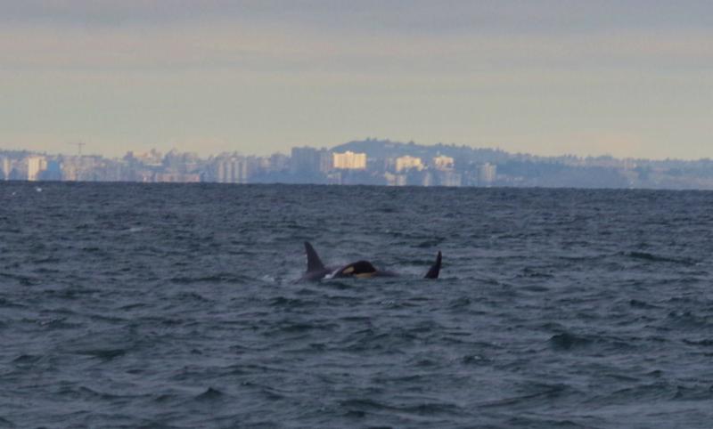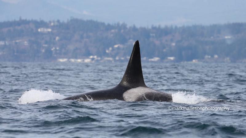 | T085B (born 1995) west bound Juan de Fuca Strait - off of Sooke, BC. Photo by Mark Malleson, January 28, 2017 (taken under permit #MML-001) |