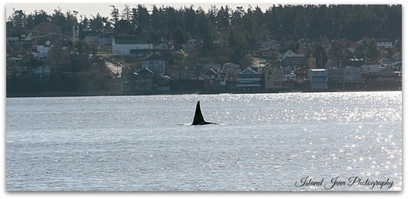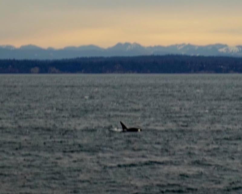 | Looks like T47E. Penn Cove backdropped by the town of Coupeville, Whidbey Island. Photo by Jennifer Swanson Dohner, January 31, 2017 (ID notes by Melisa Pinnow, Center for Whale Research) |