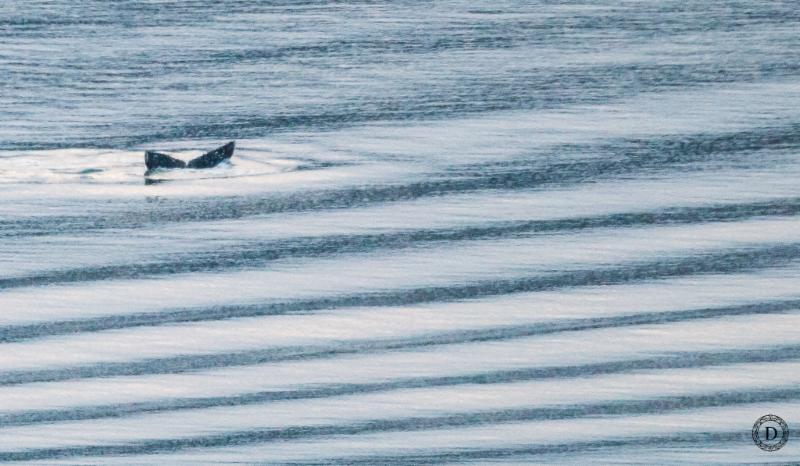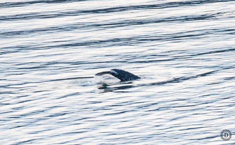 | The over-wintering juvenile humpback goes on a dive in the Tacoma Narrows directly out from the Narrows Viewpoint at Point Defiance Park, Tacoma. Photo by Desiree Sauve, January 27, 2017 |