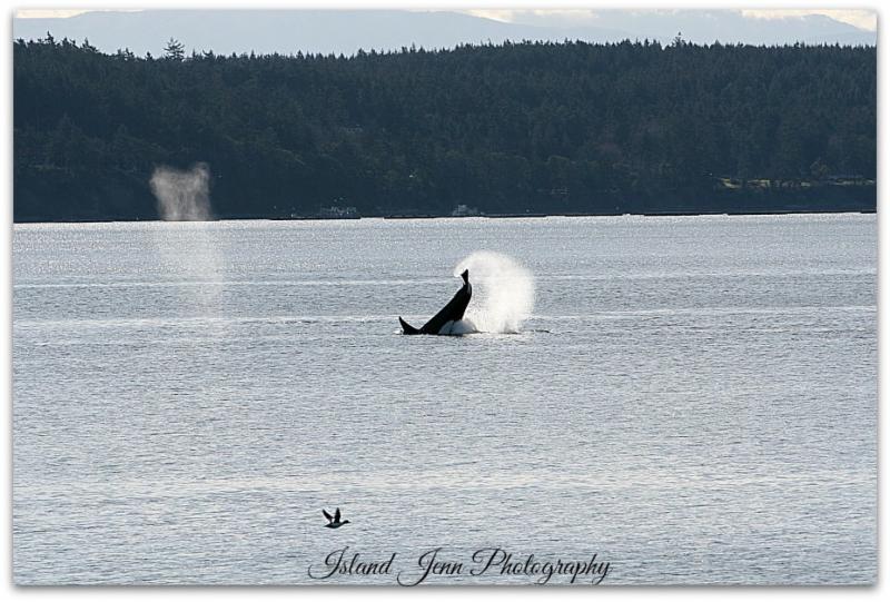 Bigg's killer whales have been making the rounds through out the Salish Sea this past week. A large group was found in Haro heading north; the T85s hung out for a few days before heading back out west; for several days one unidentified pod (possibly the T46s) was seen mostly cruising Possession Sound and Saratoga Passage; and the T46s were hunting and celebrating with cartwheels and breaches in Penn Cove.