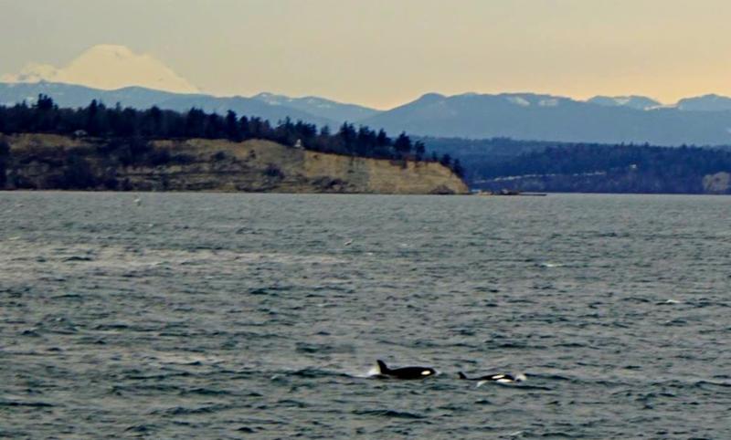 | A female orca swimming Possession Sound near Clinton, Whidbey Island backdropped by Camano Head, the Cascade Mountain range and Mt. Baker. Photo by Jill Irwin, January 29, 2017 |