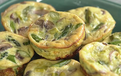 Breakfast recipes. Included: make-ahead mini frittatas with leeks and asparagus; morning glory baked oatmeal; peanut butter-and-grapes wrap; and avocado toast with egg.